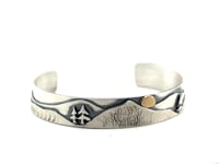 The sterling silver cuff bracelet capture the majesty of nature's beauty in a wearable work of art. Hand fabricated with piercing and overlay technique. Two layers of sterling silver mountains, with reticulation on the foreground layer, adding a beautiful texture. Pine trees on either side of center add another layer of beauty, along with a 14k gold rising sun in the background evokes an image of the eternal bond between earth and sky.