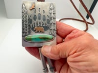 I hand drew, hand sawed, layered and soldered each piece in this very Bolo with a Bear in the Woods scene. The bolo features a bear paw print, pine trees, and a black bear walking above a beautiful, uniquely cut piece of Royston Turquoise.