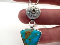 Handcrafted with meticulous detail, this one-of-a-kind Kingman Turquoise Pendant embodies both celestial and earthly beauty. The front features a brilliant 3mm citrine gemstone set within a silver sunburst, symbolizing warmth and light. The back reveals a serene nighttime scene, with a crescent moon resting above a hand-cut pine tree, both overlaying the stunning blue-green, high quality Kingman Turquoise.