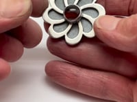 Two layers of Sterling Silver, hand pierced, layered and soldered with a beautiful red Garnet Cabochon.
